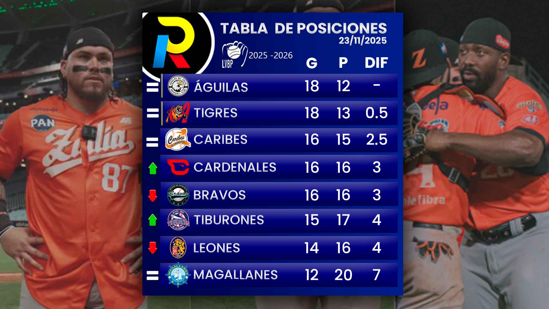 Así va la LVBP 2025- 2026 luego de lo vivido este domingo 23 de noviembre y de acuerdo con nuestra tabla de posiciones actualizada con todos los equipos del beisbol venezolano.