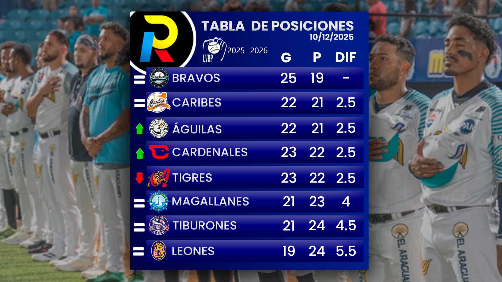 | Águilas del Zulia | 22 | 21 | 2.5 | ⬆️ |